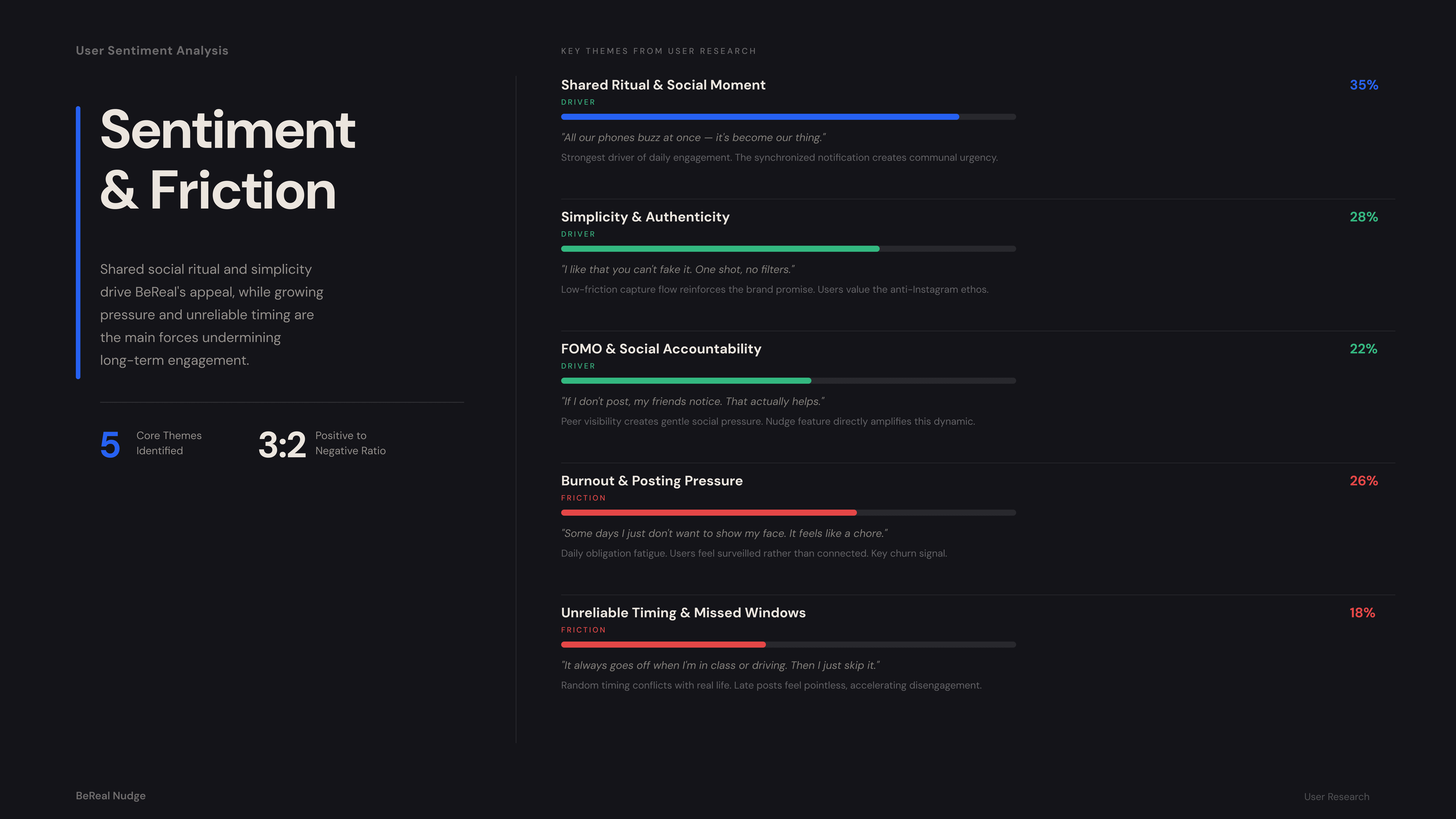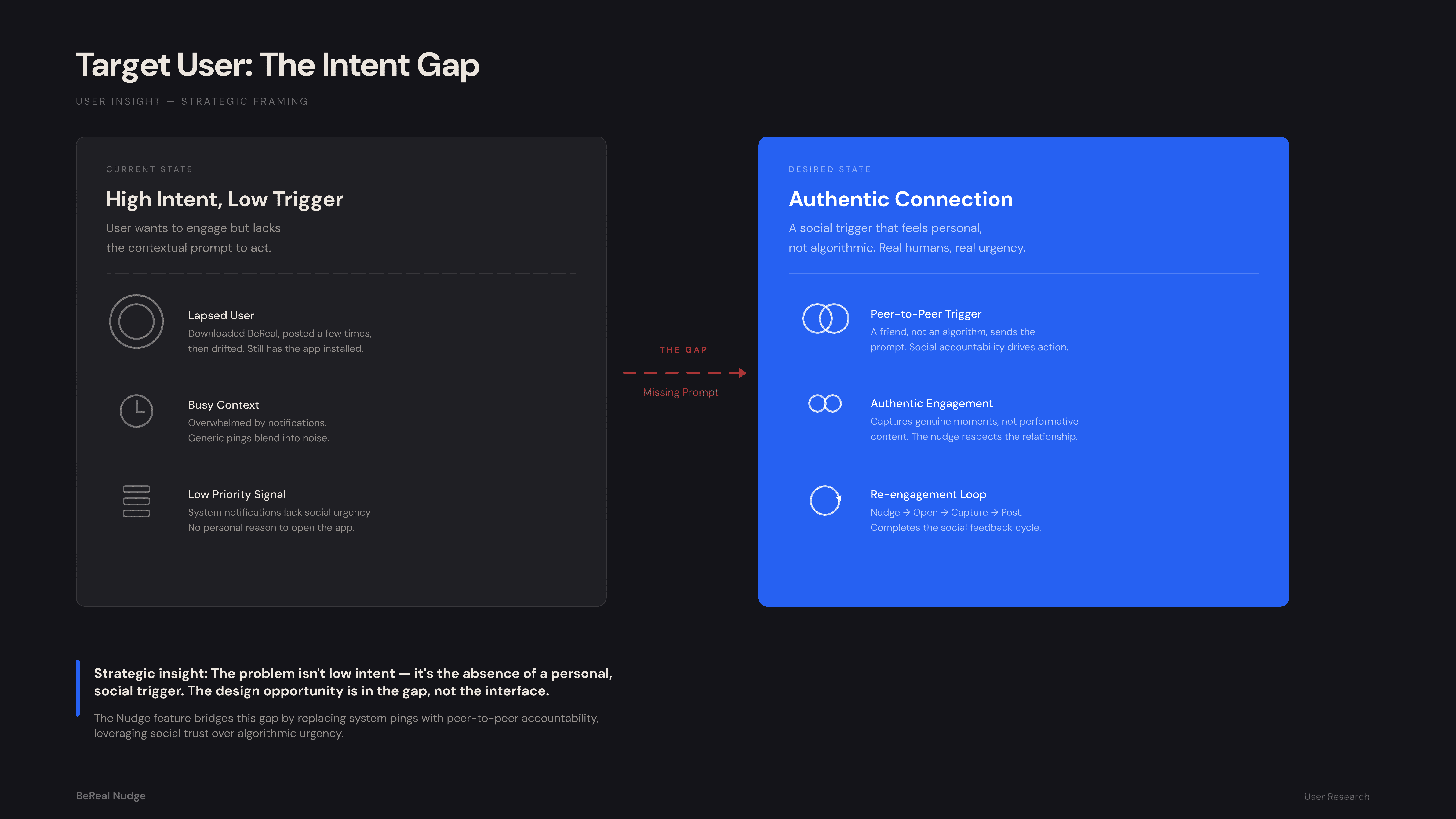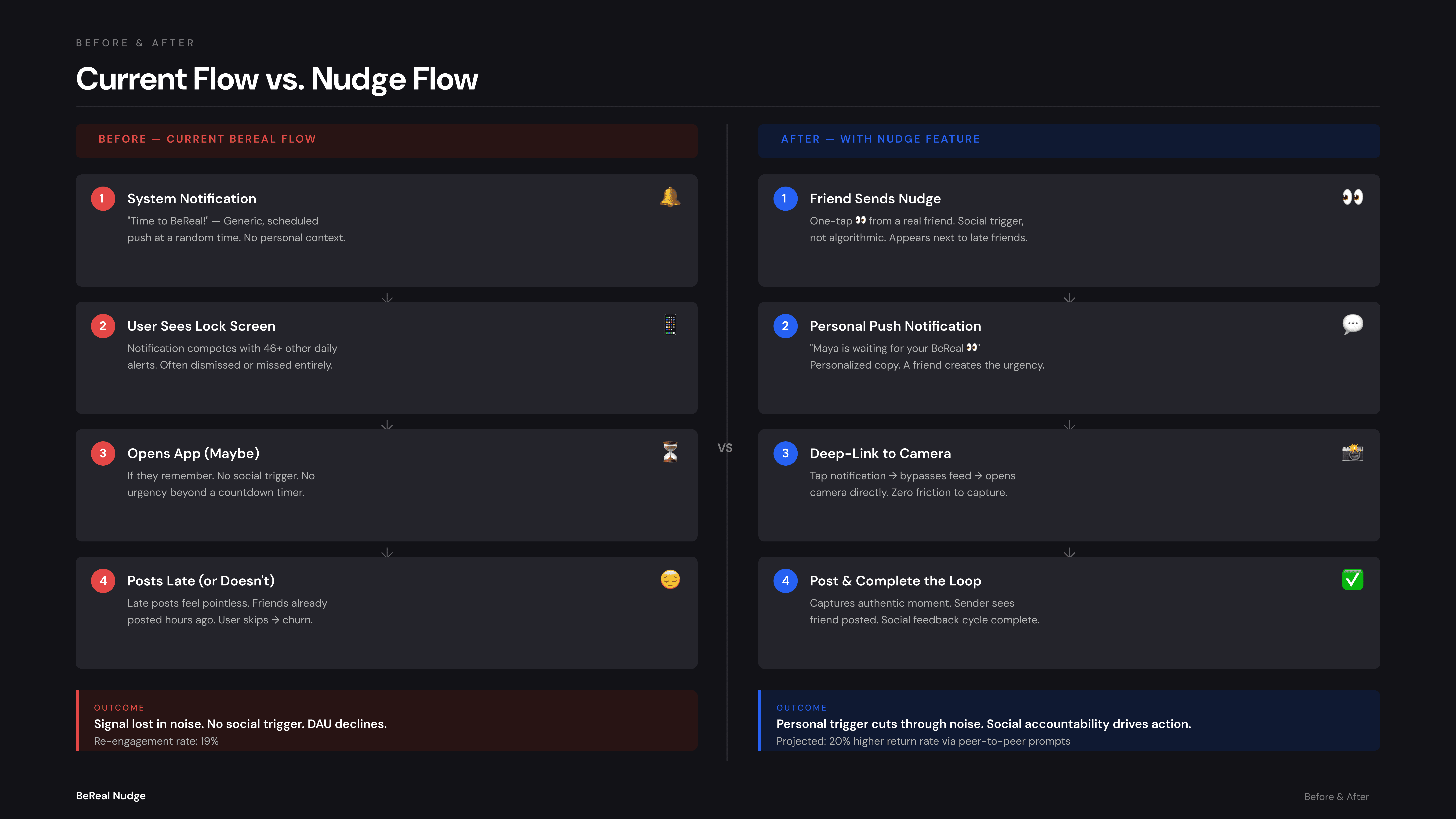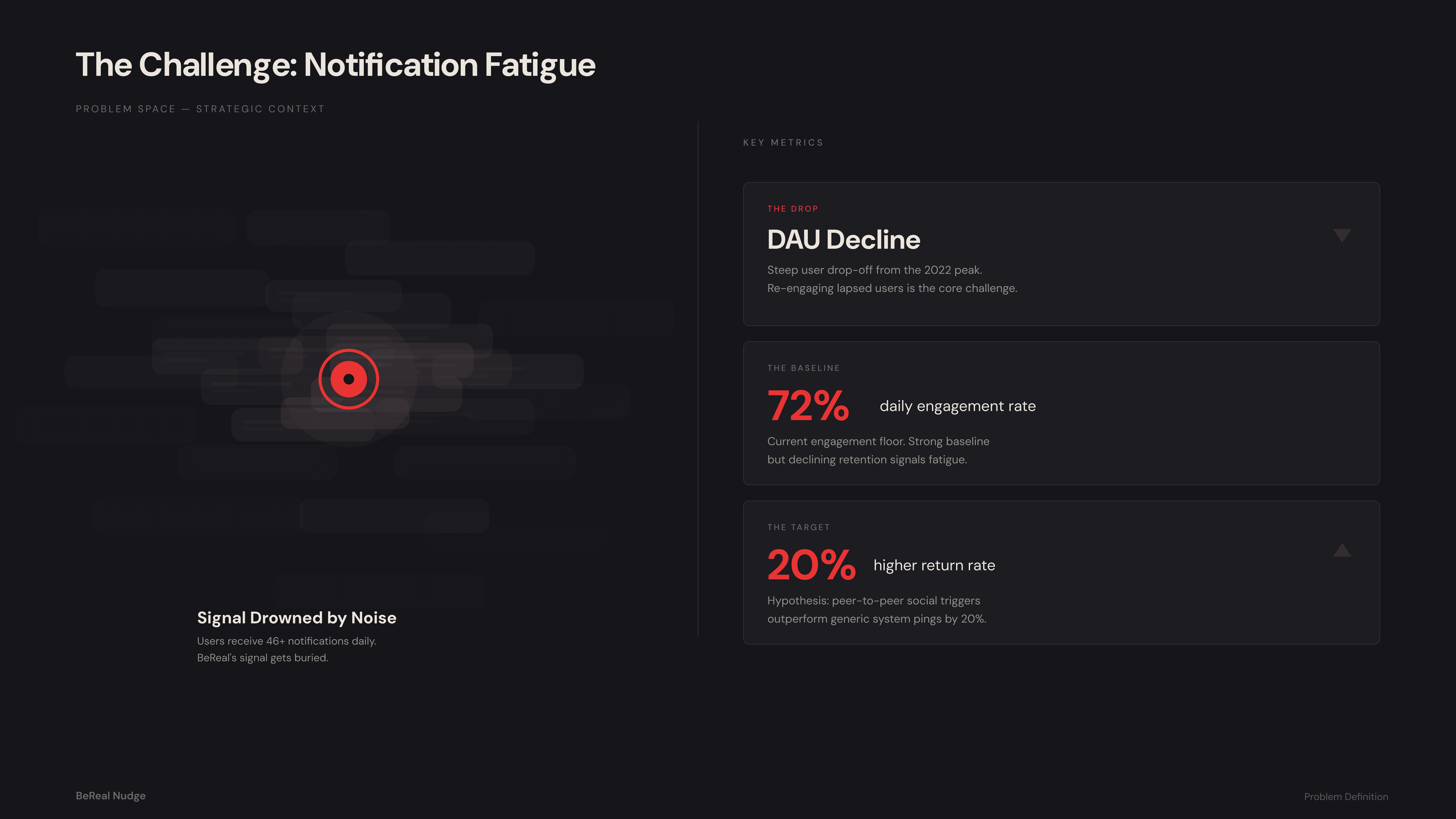 BeReal’s core value is authenticity, but generic, automated push notifications were increasingly blending into digital background noise. This notification fatigue causes users to miss their daily 2-minute posting windows, resulting in stale feeds and a drop in Daily Active Users (DAU). The challenge is to increase daily engagement without relying on algorithmic manipulation, UI clutter, or competitive streaks.