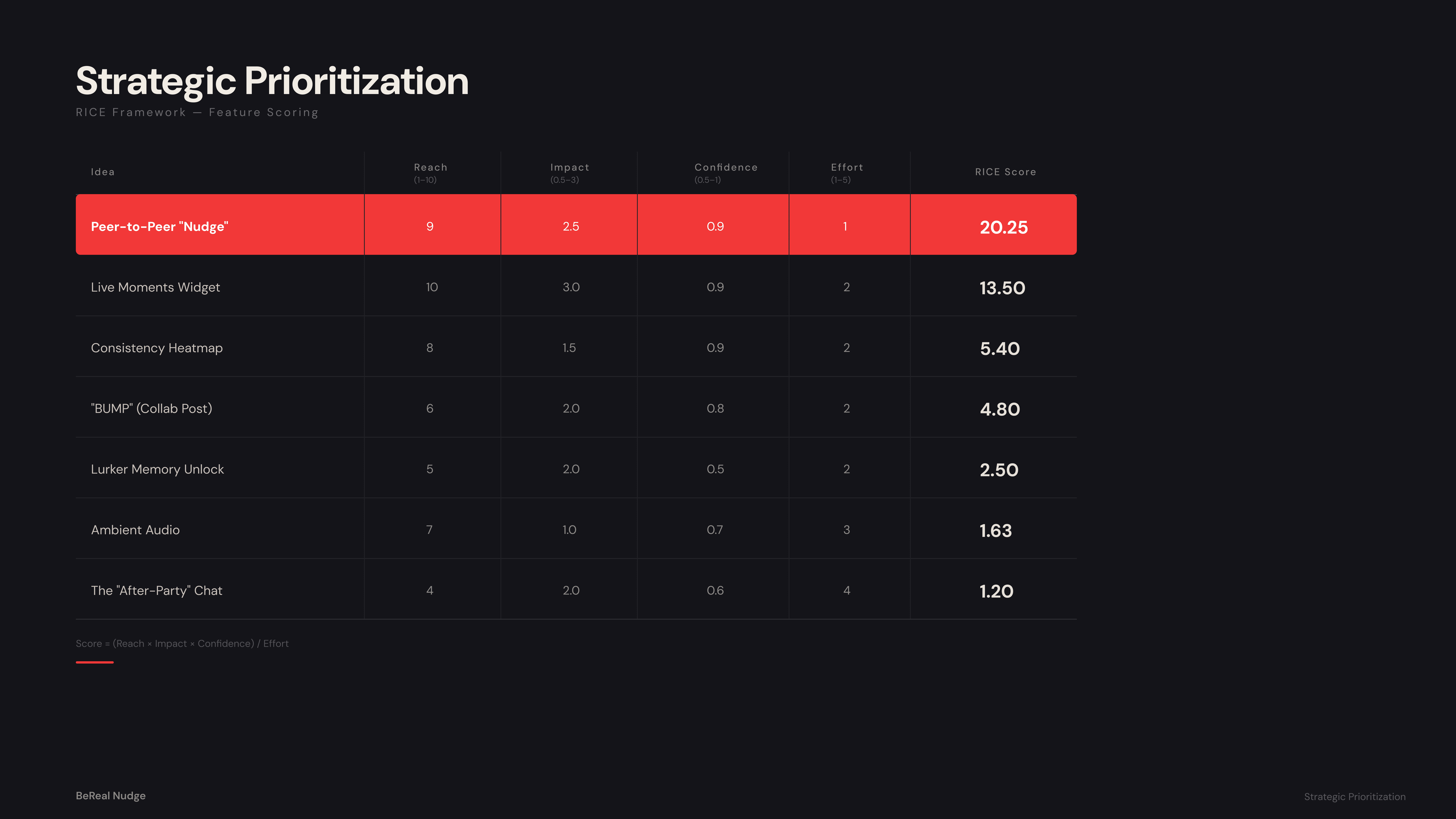To move from brainstorming to evidence-based decision-making, I evaluated several potential engagement features using the RICE (Reach, Impact, Confidence, Effort) scoring framework. Ideas ranged from "Live Moments" widgets to collaborative posts. By objectively scoring these concepts, it became clear that a low-friction, peer-to-peer prompt offered the highest impact for the lowest engineering lift, perfectly aligning with BeReal's straightforward ethos.