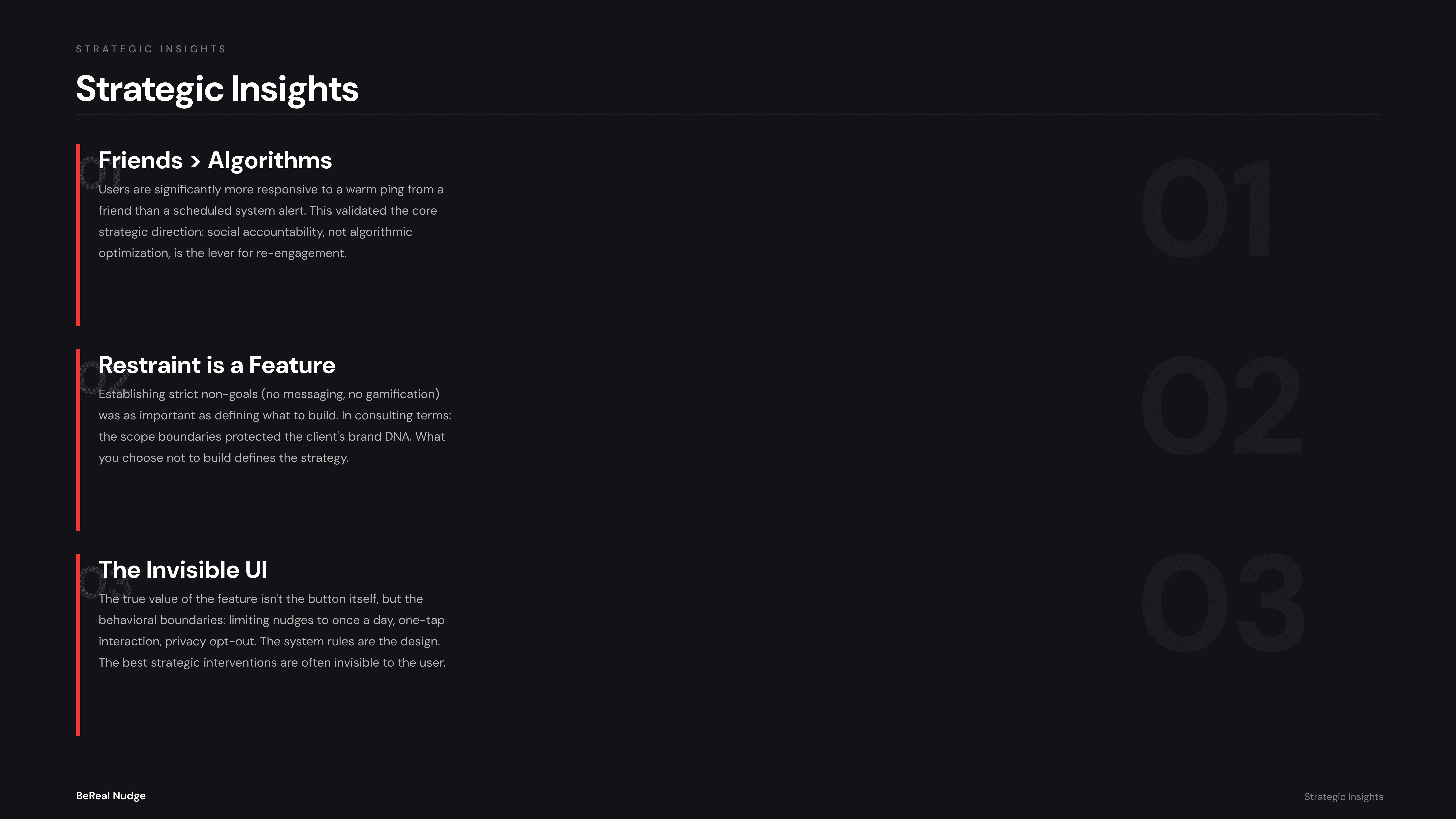 Restraint is a Feature: Coming from an industrial design background, the instinct is often to focus on physical form and adding capability. However, establishing strict digital non-goals (no messaging, no gamification) was crucial to protecting BeReal's minimalist DNA.