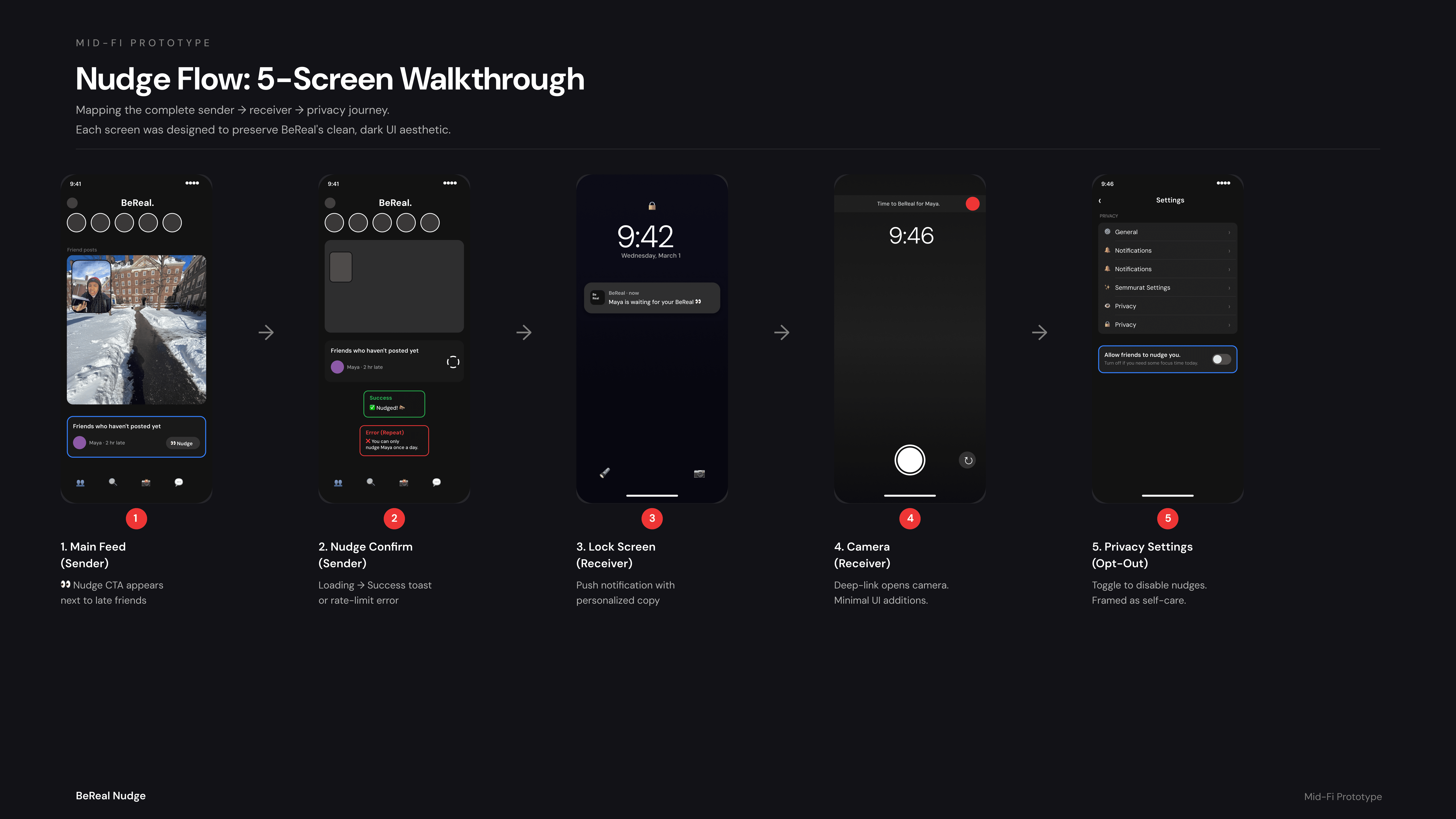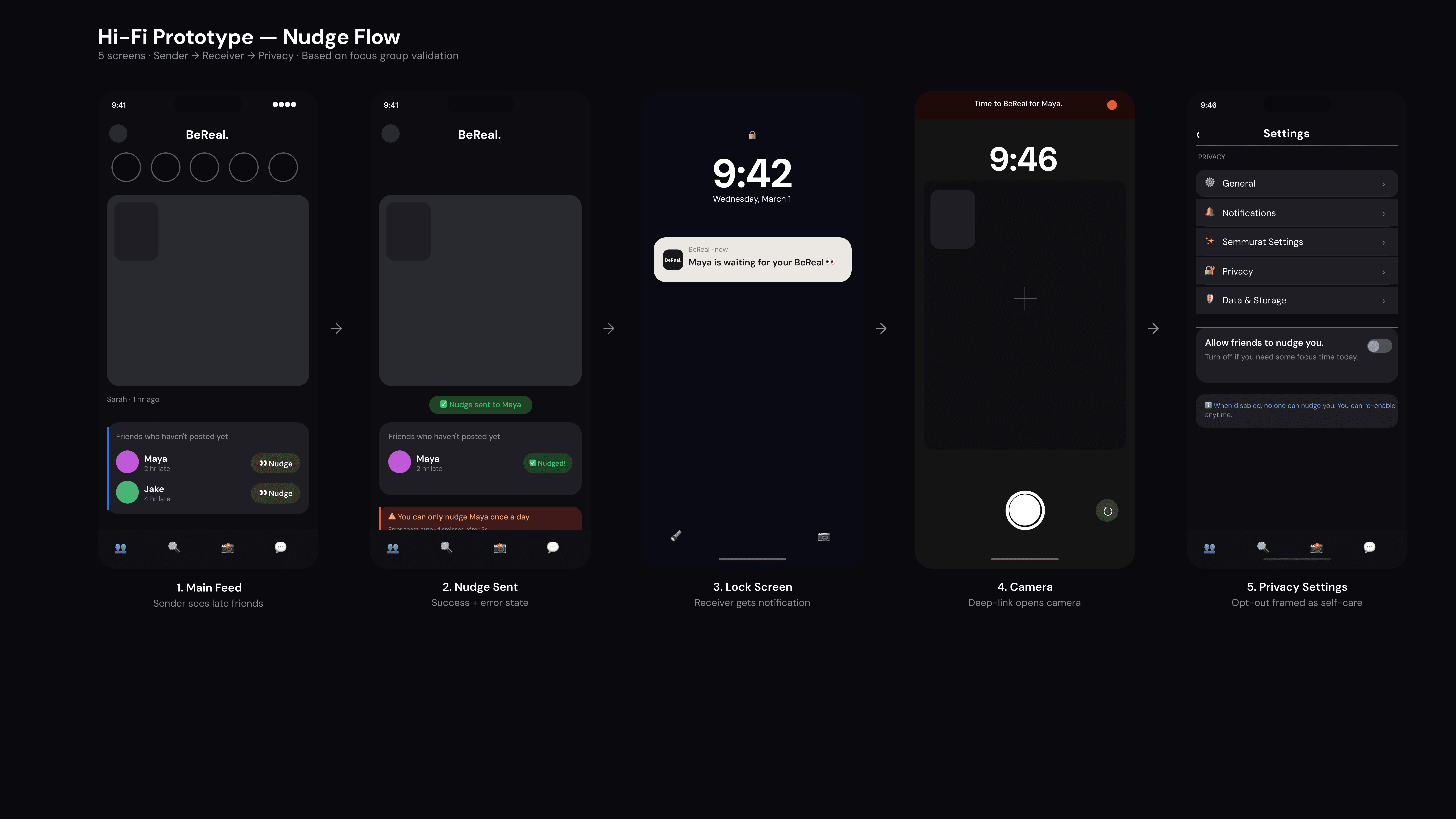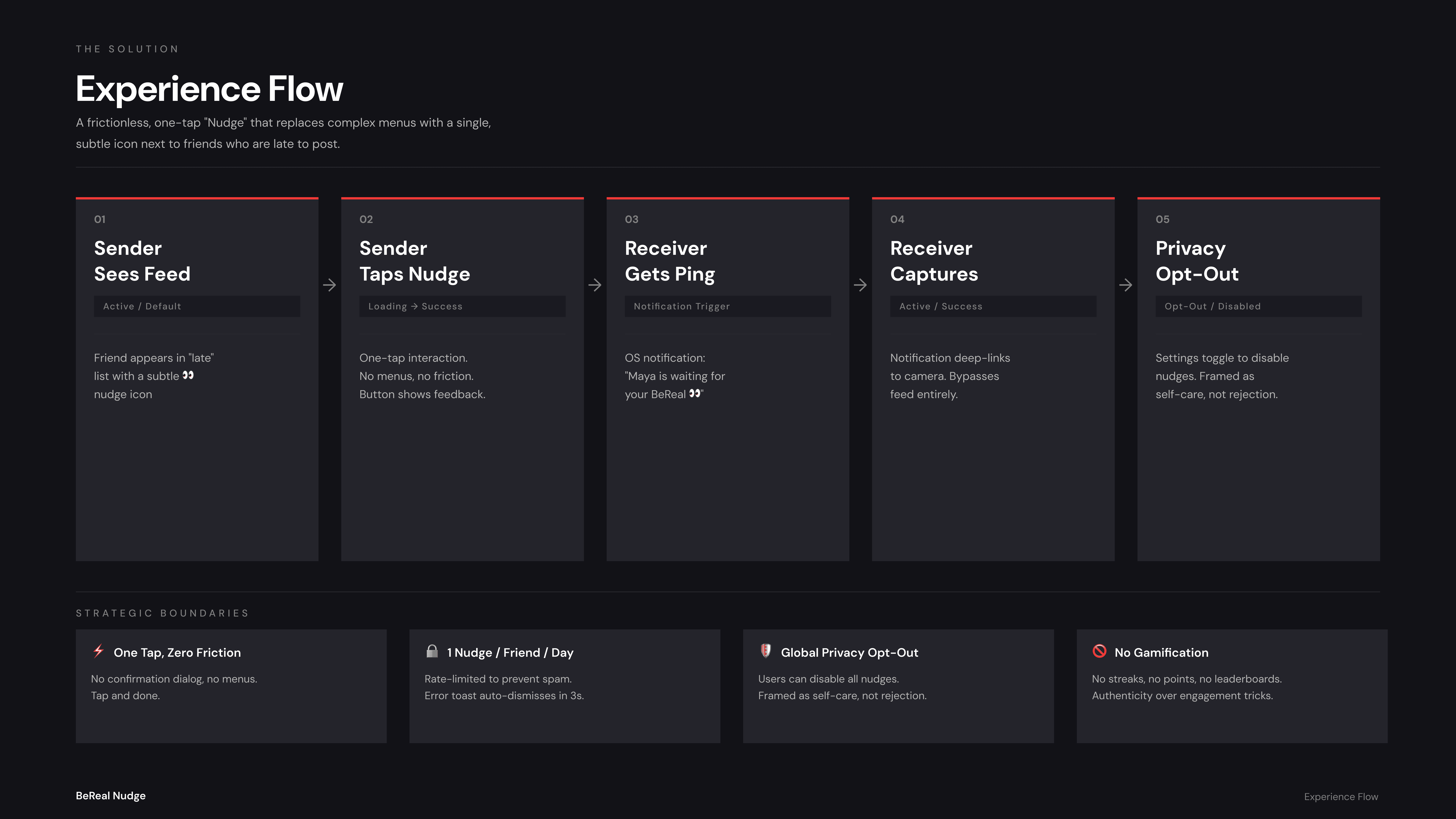 The proposed solution is a frictionless, one-tap "Nudge" interaction that replaces complex menus with a single, subtle icon next to the names of friends who are late to post. The system architecture was mapped to cover both the "happy path" and critical edge cases. When a sender taps the nudge, it triggers a simple OS-level notification for the receiver: "[Friend's Name] is waiting for your BeReal 👀". The flow explicitly includes error states (preventing duplicate nudges) and a global privacy opt-out in the settings, ensuring users maintain total control over their digital boundaries without disrupting the app's clean geometry and muted aesthetic.